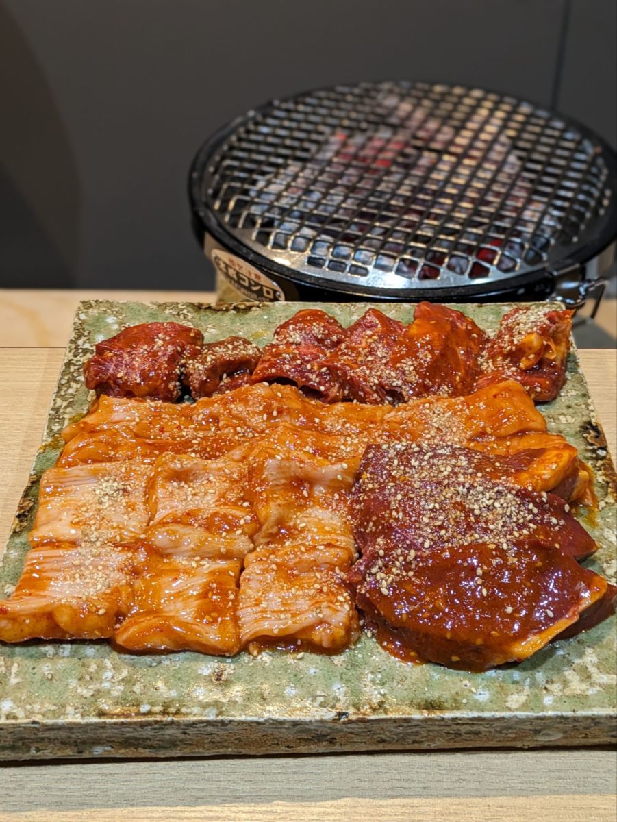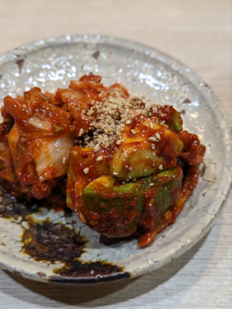 お次は白菜、アボカド、スナップえんどうなどの変わり種が嬉しいキムチ3種盛り、今から焼肉を食べるの舌が馬鹿にならない位の辛味で一瞬で食べきりました。