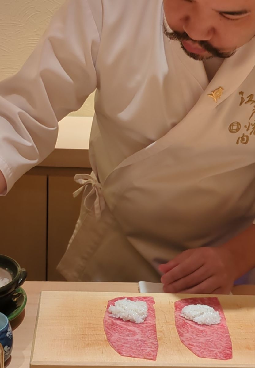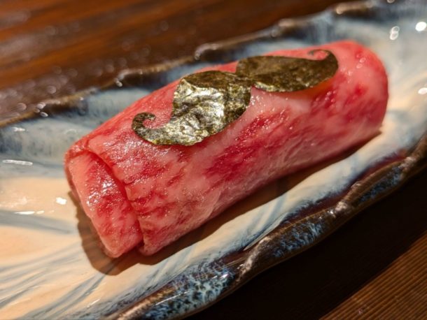 ロール状になっててシェフのチャームポイントのチャップリン髭の型の海苔がちょこんとのってます。