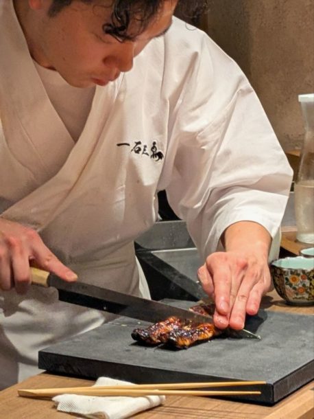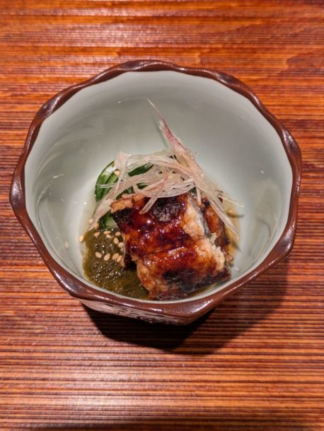 焼きたてのタレ焼きした鰻と蛇腹胡瓜と細もずく