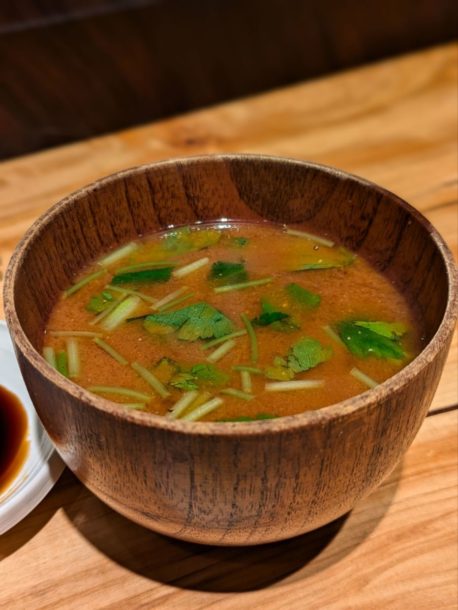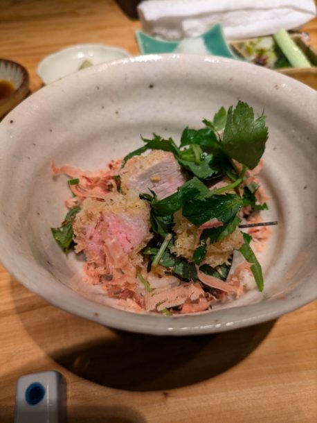 昆布、三つ葉、鰹節などが入って醤油で食べるカツ丼。