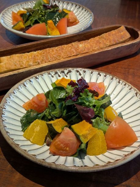 南瓜、グリーンリーフ、トマトとボリュームもしっかりあり、柑橘系の果実が良いアクセント。ドレッシングも主張しすぎず、全体的にバランスの取れた上品な味付けでした。