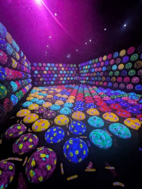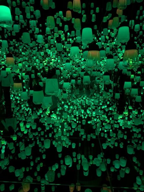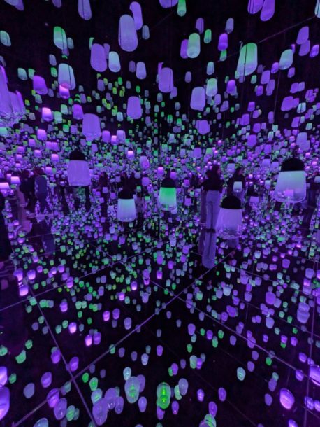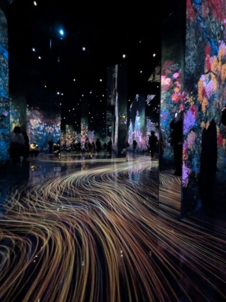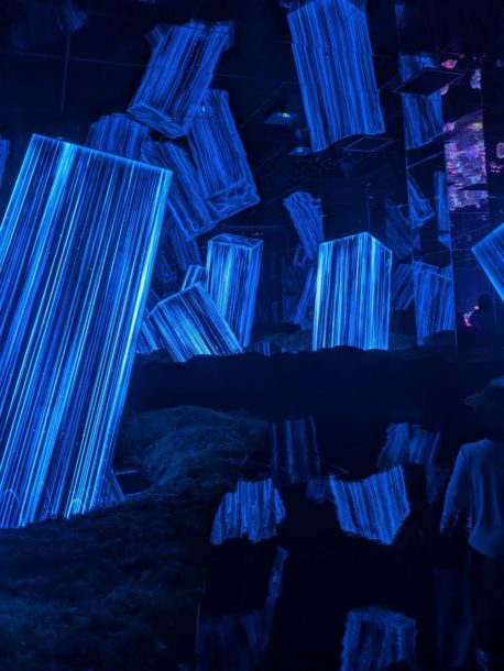 光の点が集まって渦のような構造を作り出し、その中を歩いても光のつながりは途切れません。スマートフォンを使って新しい光の要素を空間に加えることも可能で、その要素が他の人の作品と相互に作用しながら、空間全体が絶えず形を変えていきます