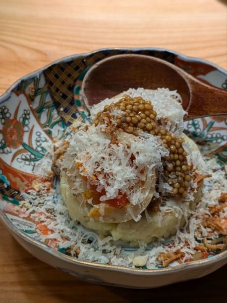 ポテト、濃厚な半熟卵、削りたての風味の良いチーズ