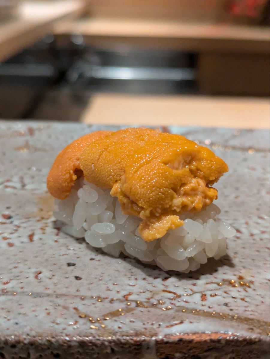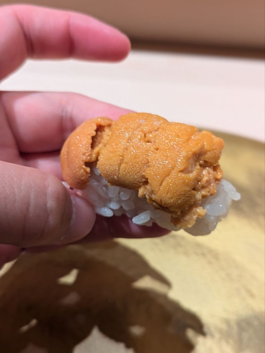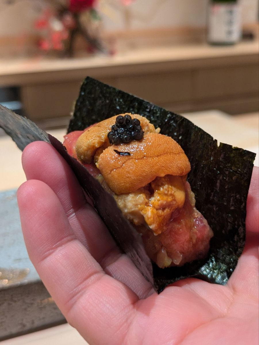 海苔の上にシャリ、上から鮪、雲丹、キャビア、金粉と豪華三昧