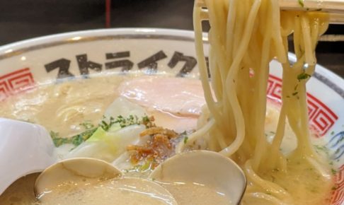 天神橋筋六丁目駅を降りて3分位の所にある超有名店のストライク軒さん 何気に初訪 15時に来たから並ばずに入店 ラーメンくる前に食べログ見てたら3·77の点数。中々やな〜。 白濁したスープの上に、鶏レアチャーシュー3枚・蛤…