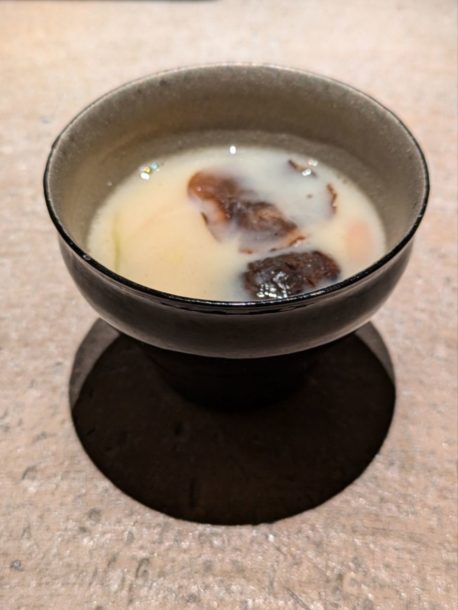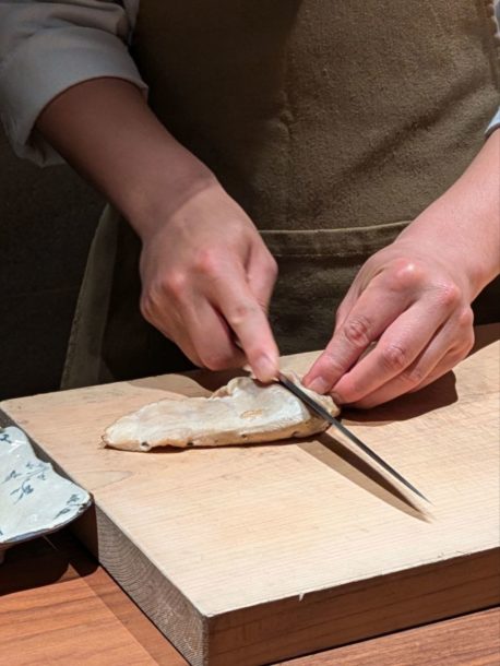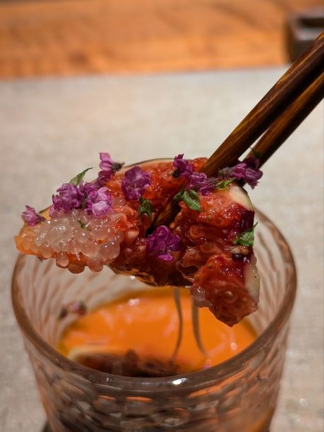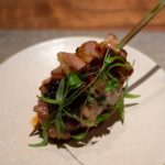 薪焼きした旬の無花果、熟成素麺、発酵フルーツトマトのピューレでガスパチョ風。酸味と甘味のバランスが非常に良かった。穂紫蘇の清涼感やフィンガーライムのプチッとした食感も楽しめた